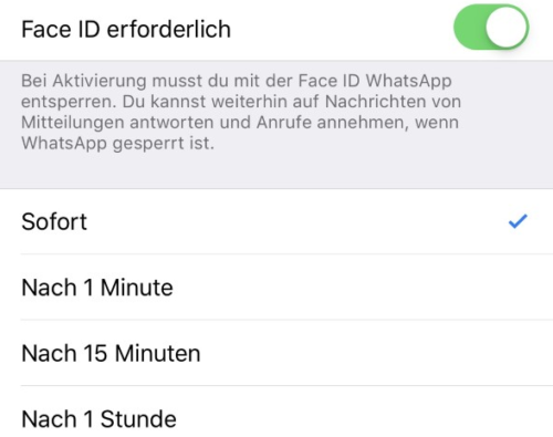 Die Funktion lässt sich flexibel konfigurieren: Ihr könnt zwischen „Sofort“, „Nach 1 Minute“, „Nach 15 Minuten“ oder „Nach 1 Stunde“ wählen. Bei „Sofort“ müsst ihr euch bei jedem WhatsApp-Start authentifizieren – praktisch für maximale Sicherheit, aber unpraktisch bei häufiger Nutzung.