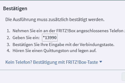 Die Fritz!Box verlangt aus Sicherheitsgründen eine physische Bestätigung: Wenn ihr ein Telefon direkt am Router angeschlossen habt, gebt den angezeigten Nummerncode ein. Alternativ drückt ihr eine beliebige Taste direkt an der Fritz!Box – das verhindert unbefugte Backup-Erstellung durch Dritte.