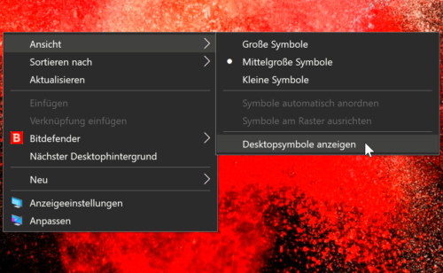 Der häufigste Grund: Die Desktopsymbole wurden ausgeblendet. Kontrolliert zunächst, ob die Desktopsymbole überhaupt angezeigt werden. Dazu klickt ihr auf dem Desktop mit der rechten Maustaste in einen leeren Bereich und wählt Ansicht > Desktopsymbole anzeigen. Diese Option muss aktiviert sein.