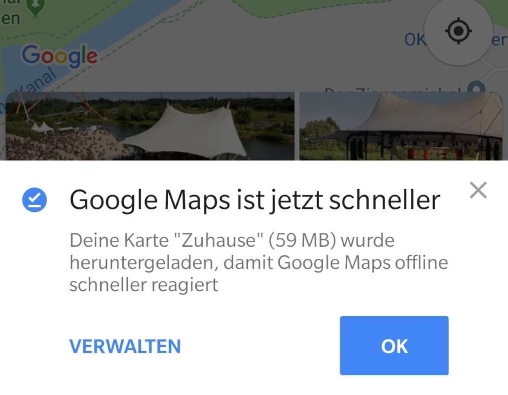Google Maps erkennt schnell die Arbeits- und die Wohnadresse, wenn ihr sie nicht eh schon eingegeben habt. Diese beiden Adressen werden automatisch für Informationen („Euer Weg zur Arbeit heute dauert…“) und als Favoriten verwendet. Nach einiger Zeit lädt die App die Karte rund um die Heimatadresse herunter. Dazu muss euer Gerät im WLAN sein.