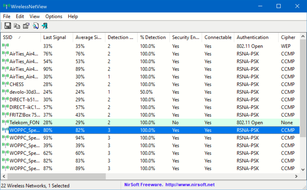 Um einen Überblick zu bekommen, ladet euch das kostenlose Tool Wireless Network View herunter. Das nimmt die WLAN-Hardware eures Gerätes und durchsucht damit die Umgebung nach empfangbaren WLANs. Die gefundenen Netzwerke werden in einer übersichtlichen Liste dargestellt. Last Signal und Average Signal zeigen die Qualität des WLAN-Empfangs an. Je näher der Wert bei 100% liegt, desto besser.
