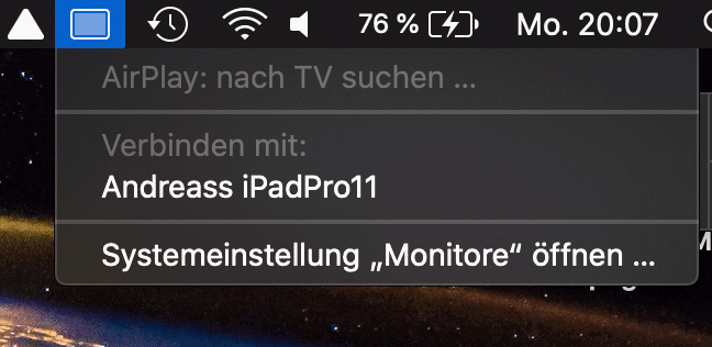 In der Menüleiste von macOS findet ihr das SideCar-Symbol – es sieht aus wie zwei verbundene Rechtecke. Ein Klick darauf zeigt euch alle verfügbaren iPads in der Nähe an.