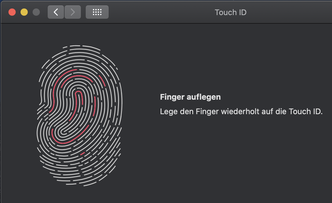 macOS fordert nun das Auflegen des Fingers in verschiedenen Winkeln und Neigungen an, um einen möglichst guten Fingerabdruck aufzunehmen. Der Prozess der Erfassung ist ein wenig langwierig, dafür aber der der Nutzung nicht: Durch die Erfassung der Randbereiche des Fingers könnt ihr diesen später sorglos irgendwie auf den Sensor legen.