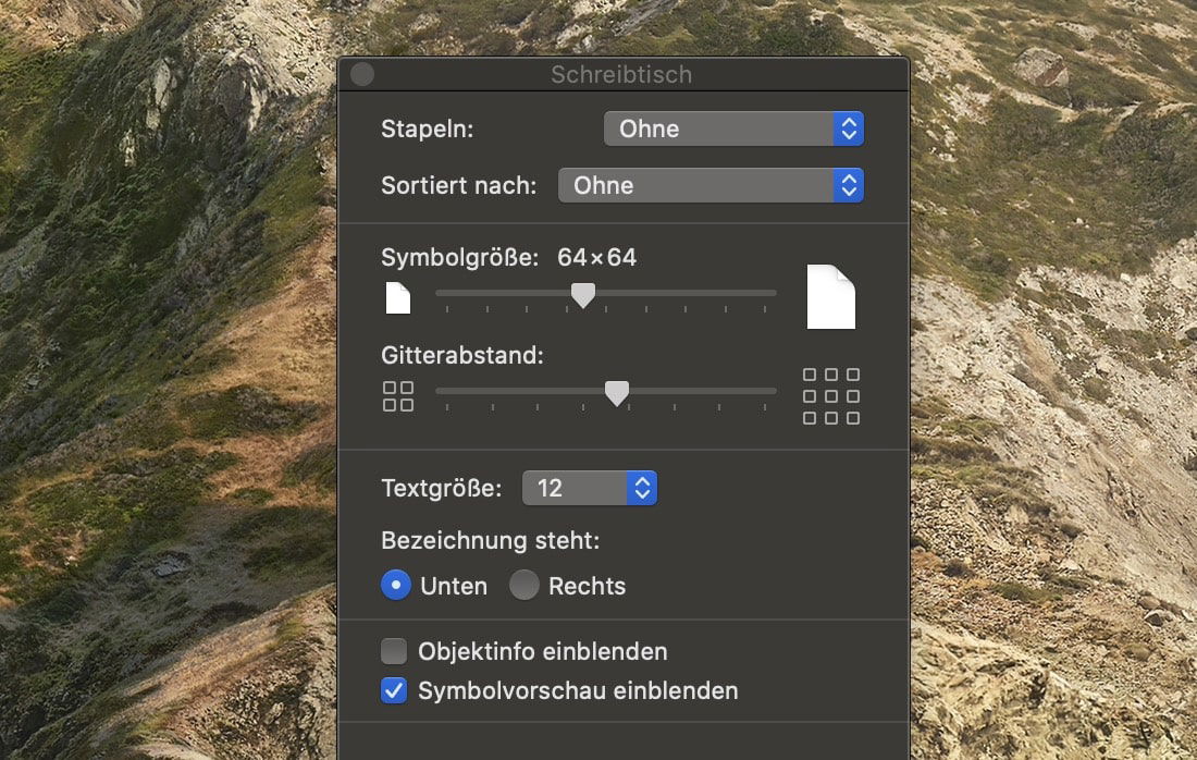 Weiterhin könnt ihr einstellen, ob die Bezeichnung, also der Text des Symbols, unten oder rechts steht und wie die Textgröße der Beschriftung sein soll. Diese Flexibilität ist besonders nützlich, wenn ihr viele Dateien auf dem Schreibtisch habt und trotzdem die Übersicht behalten möchtet.