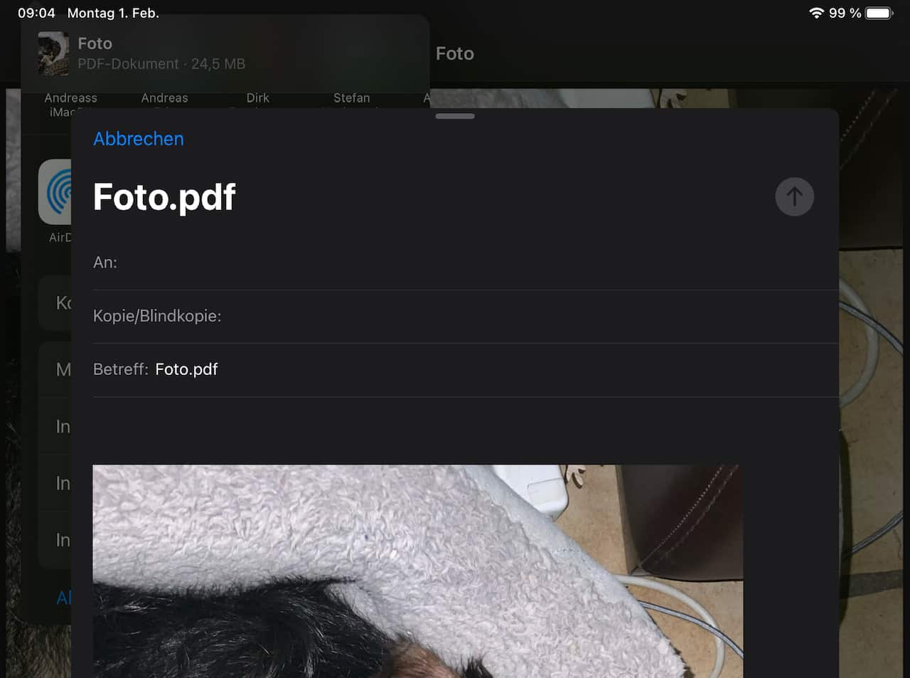 Auch wenn es auf den ersten Blick nicht erkennbar ist: Ihr habt jetzt bereits eine vollwertige PDF-Datei erstellt. Das Dokument wird in Vollbildansicht angezeigt und kann direkt weiterverwendet werden. Tippt erneut auf das Teilen-Symbol, um die Datei per Mail, iCloud Drive, OneDrive, Dropbox oder anderen Apps zu versenden.