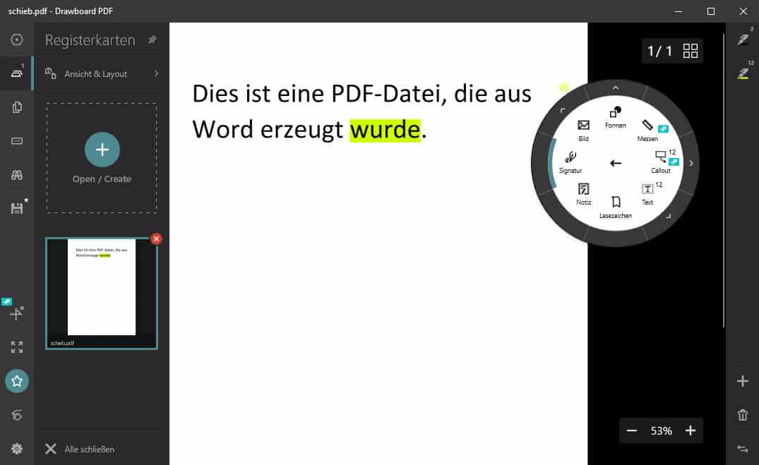 Das Erzeugen einer PDF-Datei ist der eine Schritt, die Bearbeitung ist der zeitaufwändigere und mindestens ebenso wichtige Schritt. Die Bearbeitungsfunktionen von Microsoft Edge und dem Acrobat Reader sind hier sehr rudimentär, hier ist die Windows-App Drawboard PDF, die ihr kostenlos im Windows Store herunterladen könnt.