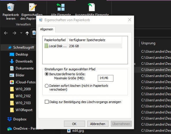 Unter Benutzerdefinierte Größe könnt ihr angeben, wie groß der für den Papierkorb reservierte Speicher sein soll. Die Standardeinstellung liegt meist bei 5-10% der Festplattenkapazität. Bei einer 1TB-SSD wären das also maximal 100GB für den Papierkorb.