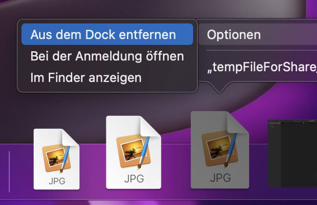 Wenn die Datei tatsächlich gelöscht ist, dann klickt ihr im Kontextmenü auf Aus dem Dock entfernen. Die Verknüpfung wird in den Papierkorb gelegt und damit aus der Dock entfernt.