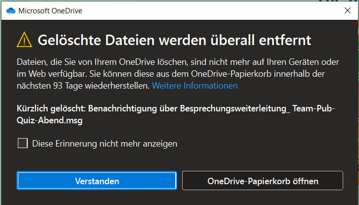 Die Dateien werden aus dem OneDrive-Papierkorb innerhalb von 30 Tagen (normales OneDrive) bzw. 93 Tagen (OneDrive for Business/Microsoft 365) automatisch gelöscht und sind dann nicht mehr verfügbar! Diese Fristen haben sich nicht geändert, aber Microsoft zeigt seit Ende 2025 deutlichere Warnungen an.