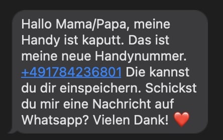 Über solche SMS versuchen diese, die immer vorhandene Sorge um die eigenen Kinder auszunutzen: Die Nachricht ist neutral genug, um nicht durch Falschinformationen aufzufallen, aber so realistisch, dass Ihr nicht unbedingt genauer darüber nachdenkt oder alarmiert seid. Kaum habt Ihr die Rufnummer im Kontakt gespeichert, kommen schnell Nachfragen nach Geld wegen eines Unfalls oder Phishing-Versuche, um an weitere Informationen von Euch zu kommen.
