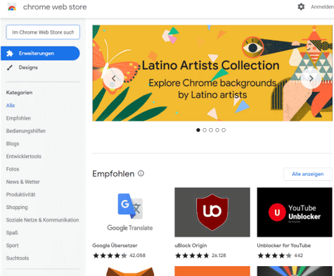 - Klickt links auf Chrome Web Store öffnen, um neue Erweiterungen zu entdecken. Der Store bietet mittlerweile eine verbesserte Kategorisierung und Bewertungen von verifizierten Nutzern.