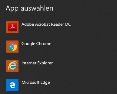 Klickt auf den Eintrag rechts daneben. Normalerweise steht da Adobe Acrobat Reader DC oder Microsoft Edge. Klickt auf den Eintrag, dann öffnet sich eine Liste von verfügbaren Apps. Wählt darin Microsoft Edge aus. Ab diesem Zeitpunkt werden PDF-Dateien nach einem Doppelklick direkt in Edge geöffnet.