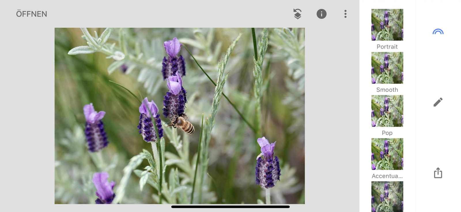 Snapseed teilt sich in drei Bereiche auf. Der erste beeinflusst das Aussehen der Bilder durch die Anwendung von Einstellungs-Presets und nennt sich Looks. Was auf den ersten Blick wie ein einfacher Filter erscheint, ist deutlich mehr: Die Looks wenden bestimmte manuelle Einstellungen in Kombination auf das Bild an. Beispielsweise Bokeh und Helligkeit/Kontrast, damit das Motiv wie eine Portraitaufnahme aussieht. Google hat 2025 neue KI-gestützte Looks hinzugefügt, die automatisch den Bildinhalt analysieren und passende Stimmungen vorschlagen.