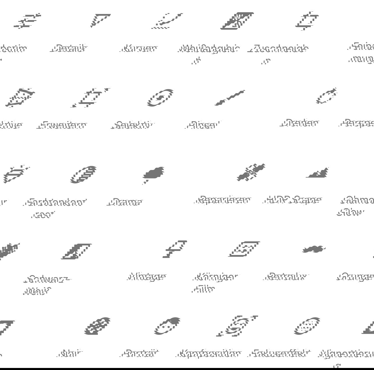 Der zweite Bereich bietet eine Vielzahl von Tools. Neben Standard-Funktionen wie Zuschneiden, Drehen und Neigen, Bildreparaturen, Feinabstimmungen und mehr findet ihr darin so geniale Funktionen wie Kopfposition. Nehmt ein Foto, in dem ein Gesicht ist, und verändert mit einem einfachen Schieberegler das Lächeln („Opa schaut schon wieder so böse“ ist damit Vergangenheit!), die Pupillengröße und die Brennweite.