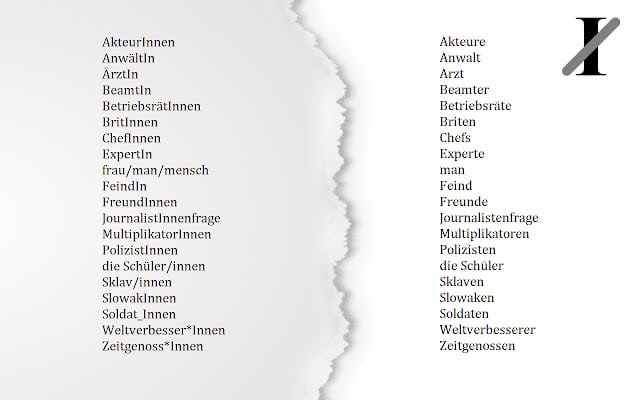 Nun ist es eine Sache, selbst sogenannte „gendergerechte“ Sprache zu verwenden. Die Freiheit besteht. Eine andere Sache ist, Texte lesen zu müssen, die in diesem Stil geschrieben ist. Wen das schmerzt, der kann sich helfen (lassen): Es gibt kostenlose „Plugins“ (also Erweiterungen, AddOns), die Binnen-Is, Sternchen und andere Konstruktionen aus den Texten einer Webseite entfernen.