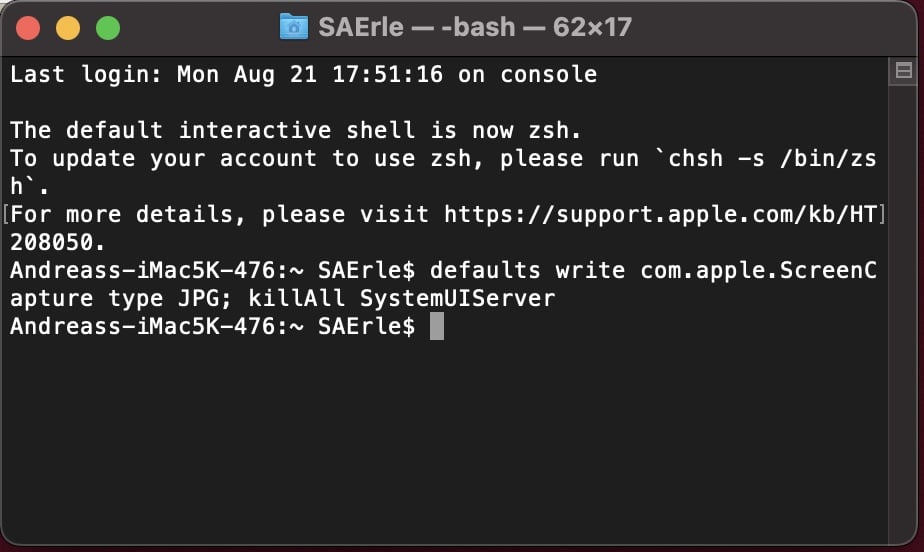 - Für JPEG: defaults write com.apple.screencapture type jpg