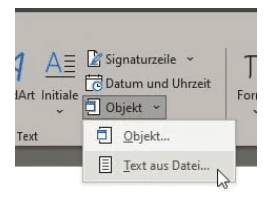 - Dann klickt auf Einfügen. Im Bereich Text in der Symbolleiste klickt neben dem Symbol von Objekt auf den kleinen Pfeil nach unten und dann auf Text aus Datei.