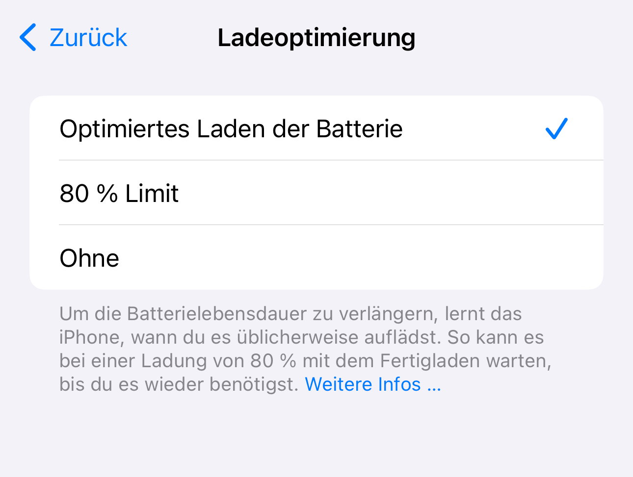 - Standard ist Optimiert – iOS entscheidet selbst, wann voll und wann nur bis 80 Prozent geladen wird.