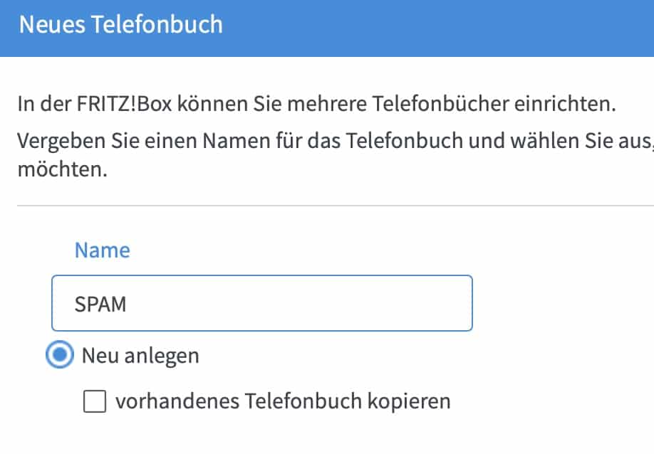 Dazu melden Sie sich an der Konfigurationsoberfläche Ihrer Fritz!Box an. Diese erreichen sie entweder unter der IP-Adresse Ihres Routers oder unter https://fritz.box. Klicken Sie nun auf Telefonie > Telefonbuch. Die Oberfläche zeigt Ihnen Ihre Telefonbücher als Registerkarten an. Wenn Sie ein neues Telefonbuch anlegen wollen, dann klicken Sie auf Neues Telefonbuch oben rechts im Fenster.