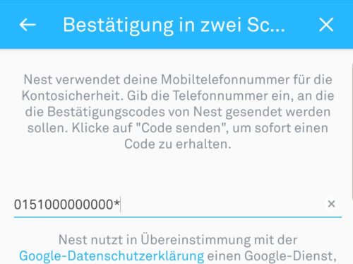 Die NEST-App bietet die Möglichkeit der Zwei-Faktor-Authentifizierung (2FA), mit der die Anmeldung nicht nur das Passwort des NEST-Kontos anfordert, sondern noch einen zweiten Faktor, in diesem Fall einen immer wieder wechselnden sechsstelligen Code, der per SMS an eine anzugebende Telefonnummer gesendet wird. Selbst wenn ein Angreifer das Kennwort hat, kann er sich ohne Ihr Smartphone und den bei einem Anmeldeversuch dorthin geschickten Nummerncode nicht anmelden.