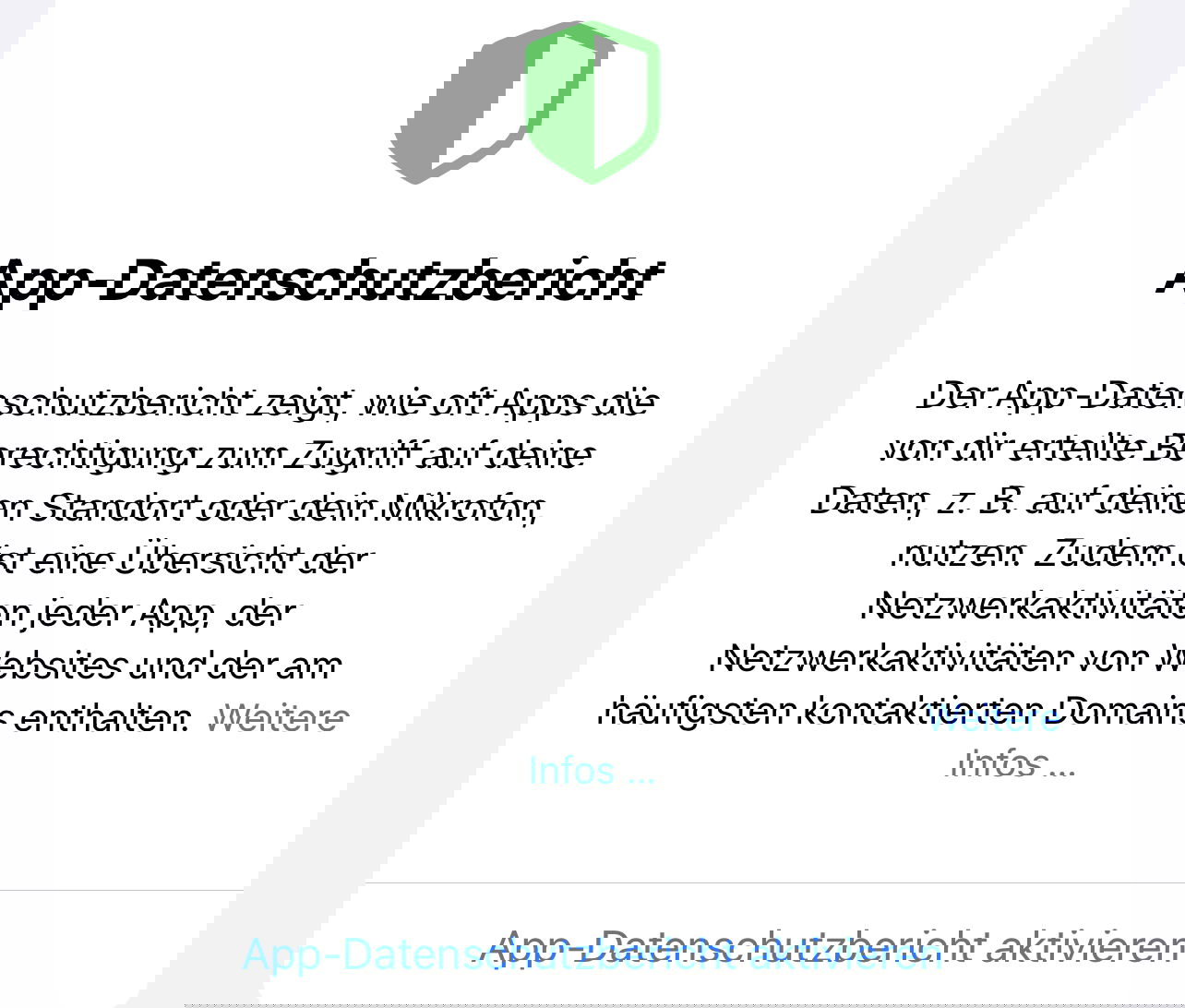 Den müsst Ihr einmalig unter Einstellungen > Datenschutz > App-Datenschutzbericht aktivieren. Danach findet Ihr im selben Menü den kontinuierlich aktivierten Datenschutzbericht für alle Apps.