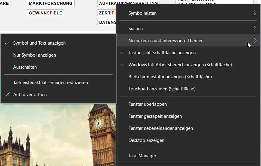 Die Einstellungen dazu findet ihr, indem ihr rechts auf die Taskleiste klickt und dann auf Neuigkeiten und andere Themen. Im Standard ist hier Symbol und Text anzeigen aktiviert.
