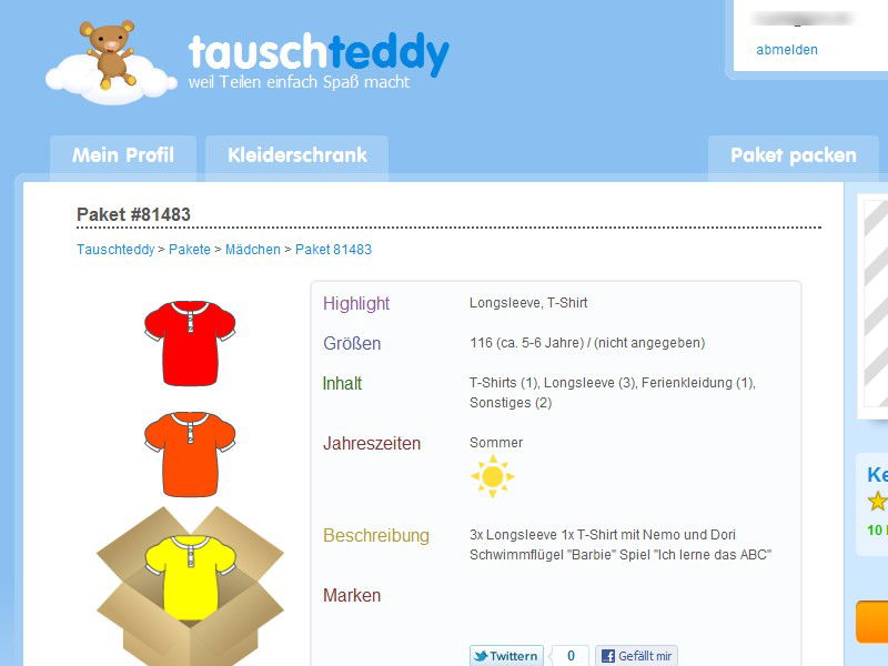 Weitere Details lassen sich ebenfalls angeben. So können zum Beispiel auch Mottopakete wie etwa Karneval, Halloween oder Kleidung für Zwillinge zusammengestellt werden. Gefällt einem anderen Benutzer der Inhalt der Kiste und er bestellt diese, sorgt tauschteddy.de automatisch für die Abholung durch einen Paketservice. Wer nicht zu Hause ist, erhält alternativ einen Paketschein und kann den Karton selbst kostenlos beim Lieferdienst abgeben.