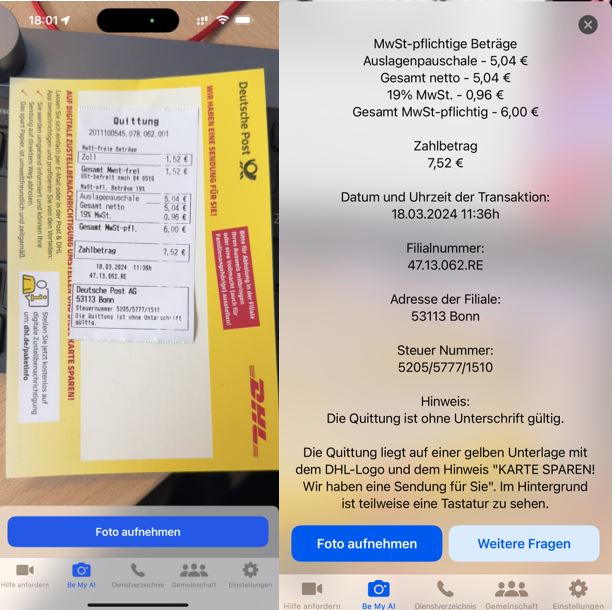 Die aktuelle Version nutzt GPT-4V (Vision) und kann weit mehr als nur Objekte erkennen. Bei einer Quittung von DHL beschreibt die KI nicht nur den Text, sondern auch Layout, Farben, Logos und sogar den Zustand des Papiers. Medikamentenverpackungen werden mit Dosierungsangaben erfasst, Straßenschilder mit Richtungsinformationen, und bei Dokumenten erkennt die KI sogar handschriftliche Notizen.