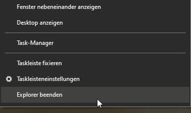 Um diese Funktion zu aktivieren, klicken Sie bei gedrückter Shift- und Strg-Taste mit der rechten Maustaste auf einen freien Bereich der Taskleiste. Auf den ersten Blick sieht das sich öffnende Menü gleich aus wie immer. Das ist aber nicht ganz richtig: Ganz unten finden Sie einen neuen Eintrag Explorer beenden.