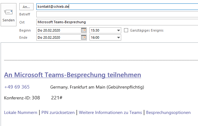Geben Sei die E-Mail-Adressen der Teilnehmer ein, legen Sie Datum und Uhrzeit wie auch den Titel fest  und versenden Sie den Termin. Die Teilnehmer können damit auch ohne installiertes Teams, sogar ohne PC, nur per Telefon teilnehmen.