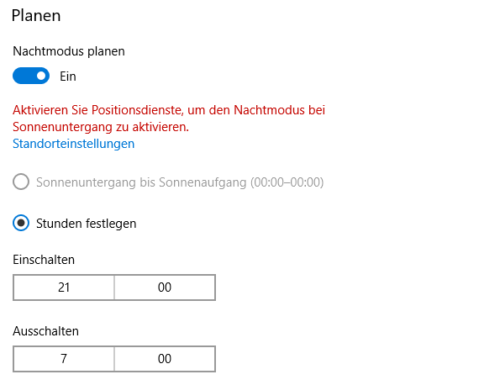 Die eine Möglichkeit ist die feste Eingabe von Start- und Endzeit des Nachtmodus, beispielsweise von 21:00 bis 07:00 am nächsten Morgen. Allerdings ist die Abstimmung mit dem Außenlicht sinnvoll: Solange ihr euch im Tageslicht bewegt, hilft der Nachtmodus nichts. Wenn ihr den Zugriff auf die aktuelle Position eures PCs zulasst, dann kann Windows automatisch den Nachtmodus einschalten, wenn die Sonne untergeht und ausschalten, wenn sie wieder aufgeht.