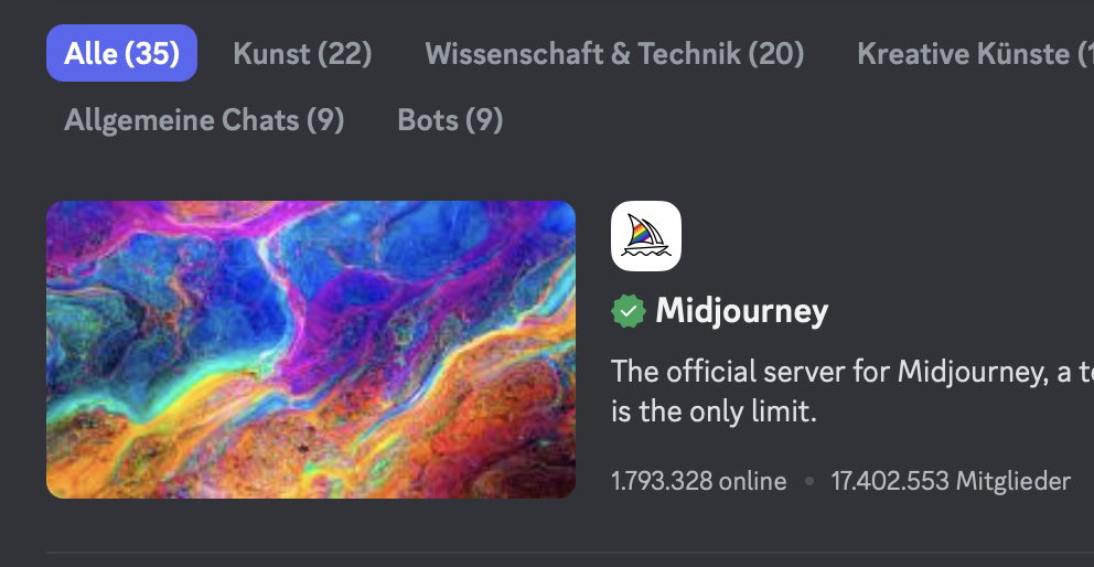 - Klickt den offiziellen Midjourney-Server an (erkennbar am blauen Häkchen).