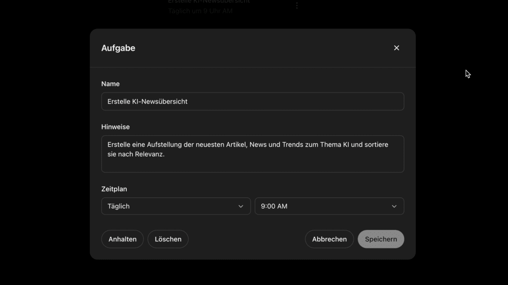 Die Kernidee hinter Tasks ist einfach: Nutzer:innen können spezifische Aufgaben definieren, die von der KI Schritt für Schritt ausgeführt werden. Zum Beispiel: