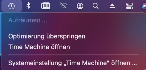 Time Machine ist direkt in macOS integriert und damit auf jedem Mac verfügbar. Der direkte Zugang versteckt sich in der Menüleiste von macOS unter dem Symbol mit der Uhr in einem kreisförmigen Pfeil. Klickt darauf und dann auf Systemeinstellung „Time Machine öffnen“. Alternativ könnt ihr auch unter Systemeinstellungen > Allgemein > Time Machine zu den Einstellungen gelangen.
