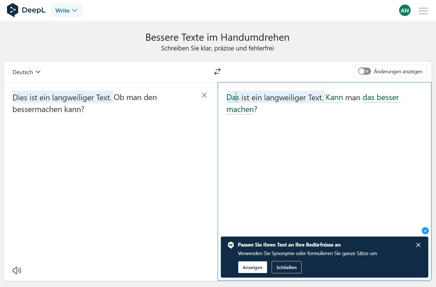 Die beste Übersetzung ist nur so gut wie der Text, den ihr in den Übersetzer hineingebt. Wenn dieser schon holprig formuliert ist, dann wird die Übersetzung auch nicht sprachlich hochwertig sein. Da kann euch DeepL Write helfen. Das ist kein Chatbot, der euch Texte schreibt, sondern ein virtuelles Lektorat, das eure Texte kommentiert und euch Alternativen anzeigt.