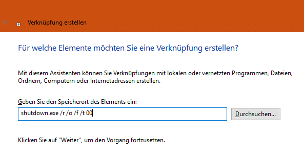 Gebt nun den Befehl shutdown.exe /r /o /f /t 00 ein und klickt auf Weiter. Dieser Befehl bewirkt folgendes:
