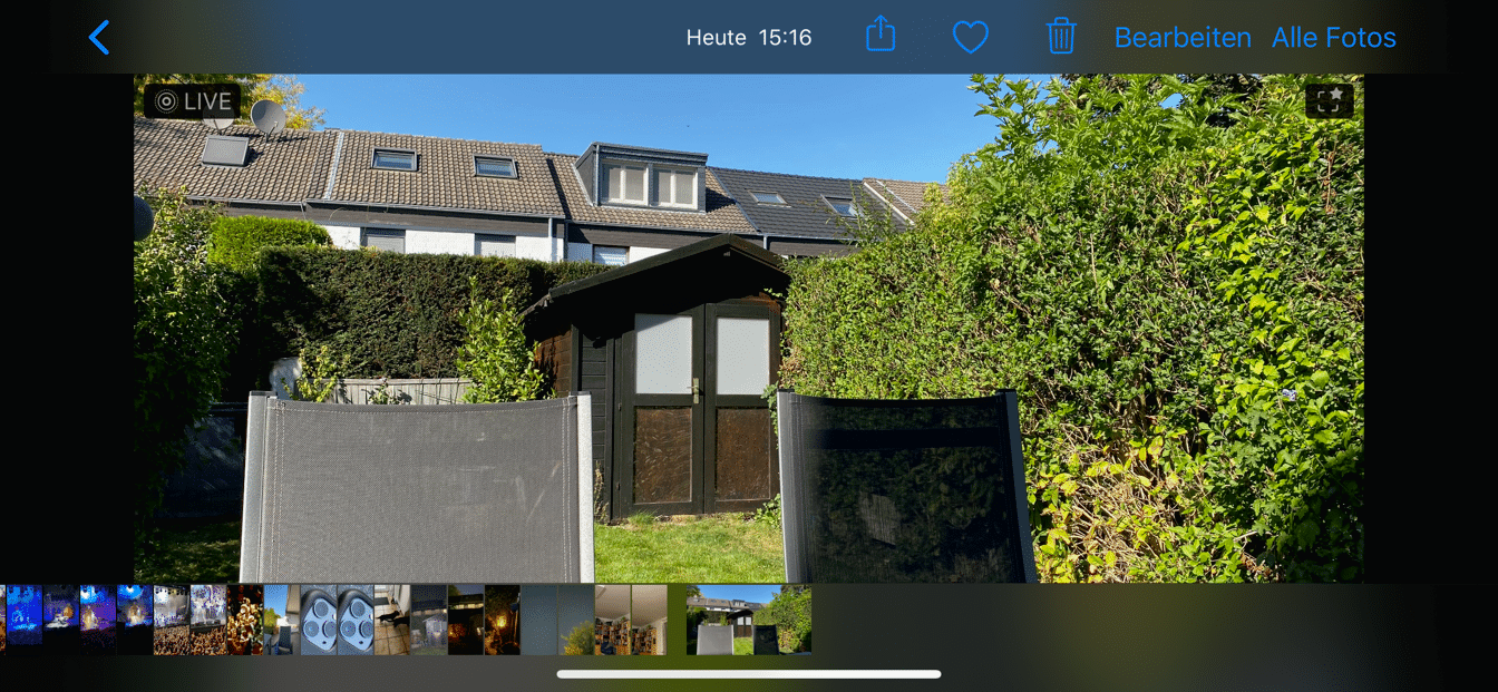 Rufen Sie in der Galerie ein Bild auf, und tippen Sie auf das Beschneiden-Werkzeug rechts unten in der Symbolleiste. Sie sehen nun den zusätzlich aufgenommenen Bereich abgedunkelt links und rechts von dem aktuellen Bildausschnitt.