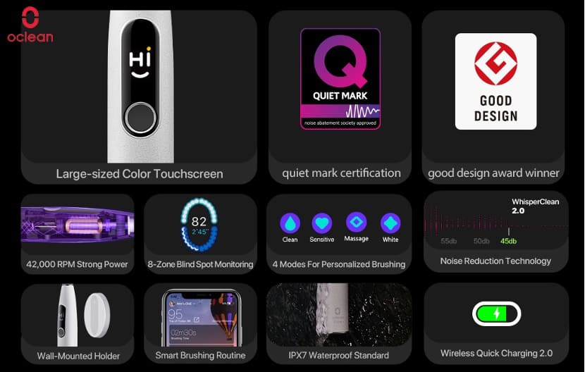 Was machte die X Pro Elite damals so besonders? Sie war eine der ersten wirklich leisen elektrischen Zahnbürsten mit unter 45 Dezibel Betriebsgeräusch – ausgezeichnet mit dem „Quiet Mark“ der Gesellschaft für Lärmbekämpfung. Der bürstenlose Motor, die aktive Geräuschunterdrückung und die Blindzonenerkennung setzten neue Maßstäbe.