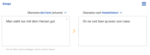 DeepL spricht 42 Sprachen – und das ziemlich gut. Die berühmte Textpassage aus dem kleinen Prinzen wird jedenfalls tadellos übersetzt. Hier werden nicht Wörter oder Sätze übersetzt, sondern auch Stimmungen transportiert. Möglich wird das, weil dieselben Anbieter eine weltweite Übersetzungsdatenbank entwickelt haben, mit jeder Menge Redewendungen.