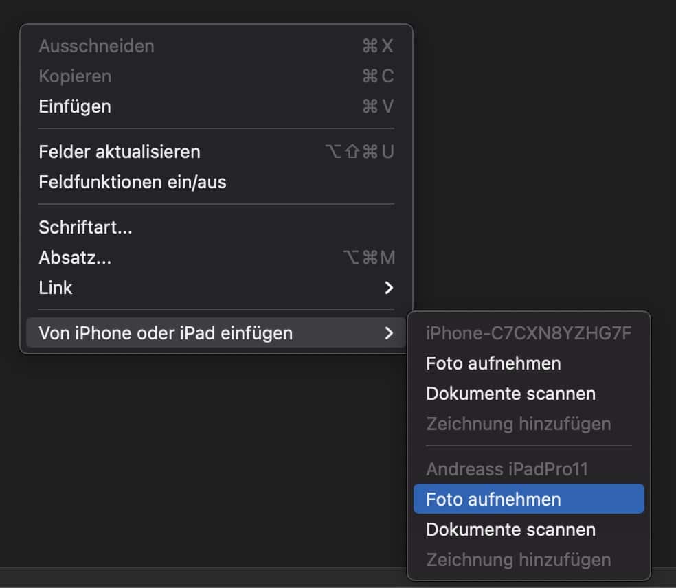 Apples Continuity-Features machen es möglich: Mit dem iPhone oder iPad könnt ihr direkt vom mobilen Gerät aus Fotos schießen, Dokumente scannen oder sogar Zeichnungen erstellen – und diese landen sofort im aktuellen Dokument auf eurem Mac. Kein umständliches Übertragen von Dateien, kein E-Mail-Versand an euch selbst. Einfach nahtlos arbeiten.