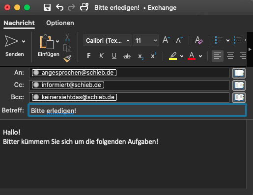 Im CC-Feld (CC für Carbon Copy, „Durchschlag“ oder Kopie) ist die Erwartungshaltung anders: Die darin aufgeführten Empfänger sollen nur informiert sein, sie haben aber keine eigenen Aufgaben. Wundert euch also nicht, wenn ein Empfänger sich von einem Auftrag in der E-Mail nicht angesprochen fühlt, wenn er nur hier drin steht!