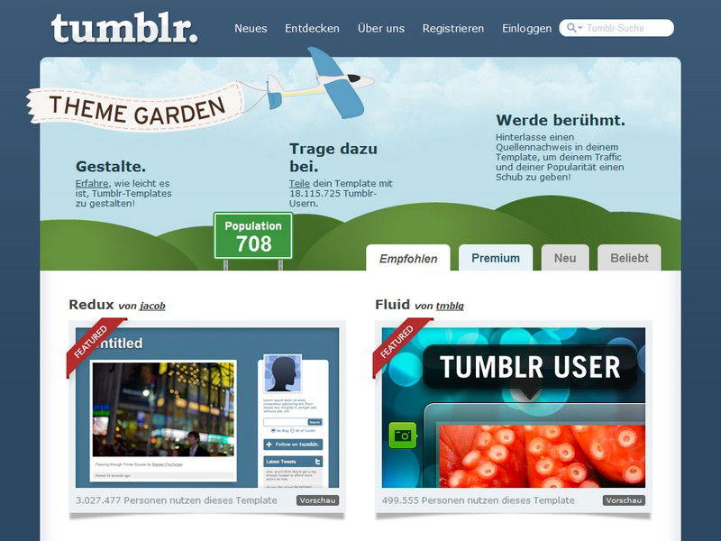 Unter www.tumblr.com legen Anwender im Handumdrehen ein eigenes Weblog an. Was den kostenlosen Dienst von anderen Blog-Anbietern unterscheidet, sind einfache Bedienung und Funktionsvielfalt. Besonders die riesige Auswahl an Designs (Templates), die man sogar noch anpassen kann, macht Tumblr attraktiv. Egal ob dem Besucher Fotos, Videos oder Texte präsentiert werden sollen: Tumblr bietet für jeden Zweck Dutzende passender Layouts.