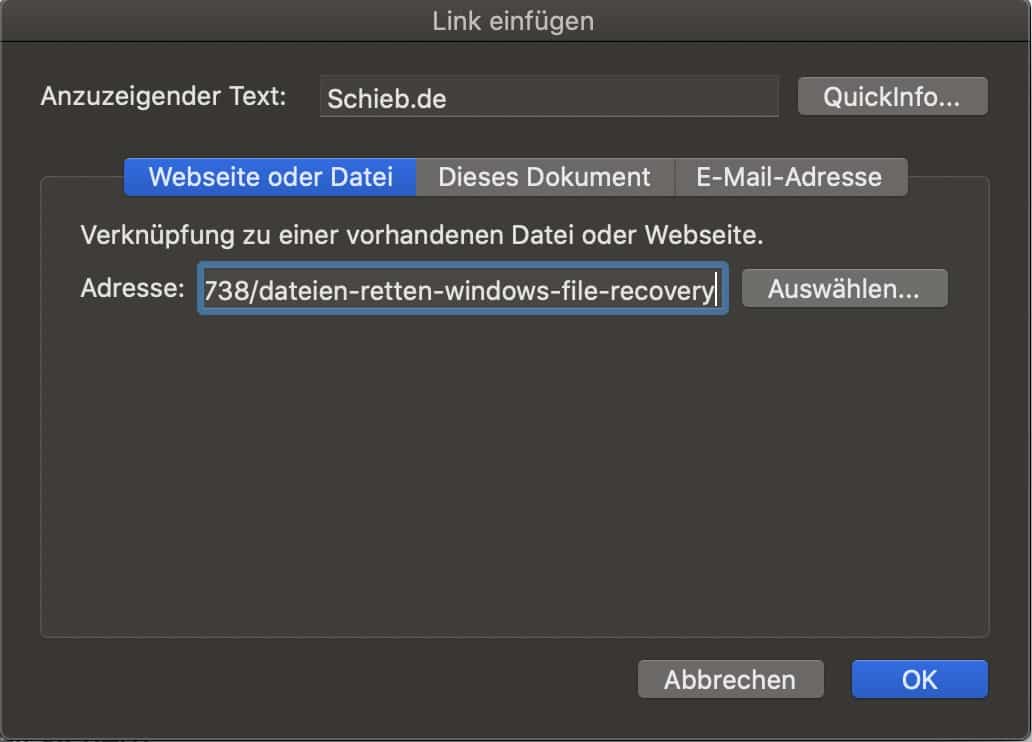 Wenn Sie stattdessen eine Datei verknüpfen wollen, dann geben Sie deren Pfad ein. Den bekommen Sie über einen Rechtsklick auf die Datei im Explorer/Finder und einen Klick auf Eigenschaften/Informationen. Wichtig dabei: Das kann nur funktionieren, wenn auch der Empfänger die selbe Dateistruktur hat und die verlinkte DAtei an der selben Stelle seiner Festplatte steht!