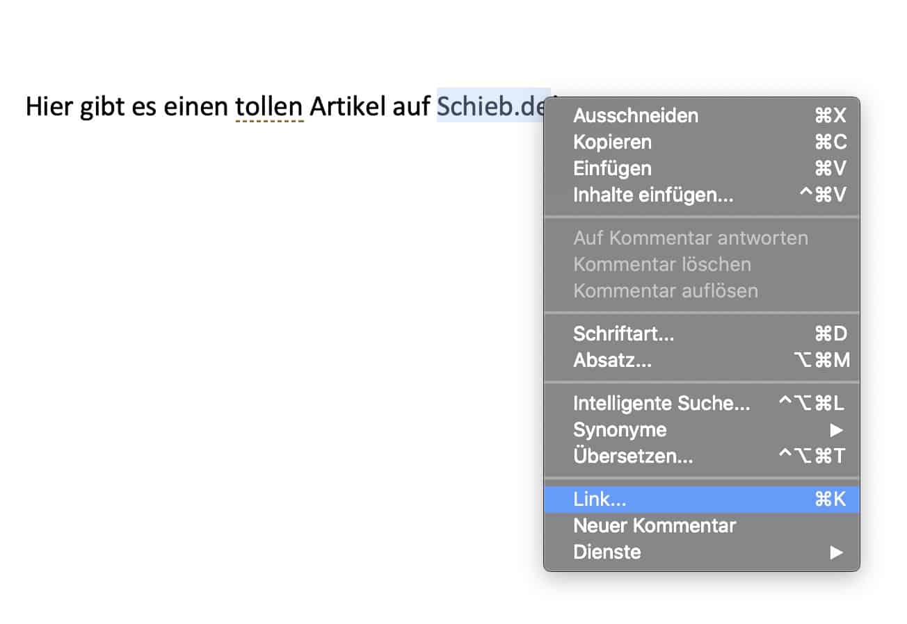 Für jeden Link gibt es einen so genannten Anker, einen Text, hinter dem der Link liegt und den der Anwender anklicken muss, um zu dem verlinkten Element zu gelangen. Dieser Anker sollte möglichst zentral sein und etwas mit dem verlinkten Objekt zu tun haben. Um nun die Verknüpfung dahinter zu legen, markieren Sie mit der Maus den Ankertext. Dann klicken Sie mit der rechten Maustaste auf diese Markierung und dann auf Link.