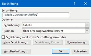 Eine Tabelle sollte idealerweise einen Titel haben, der dem Leser kurz und prägnant Auskunft darüber gibt, welche Inhalte er erwarten darf. Das müssen Sie nicht direkt im Word-Text machen. Sie können ihn direkt an die Tabelle anhängen, indem Sie die Tabelle markieren und dann in der Registerkarte Referenzen auf Beschriftung einfügen (in der Gruppe Beschriftungen) klicken.