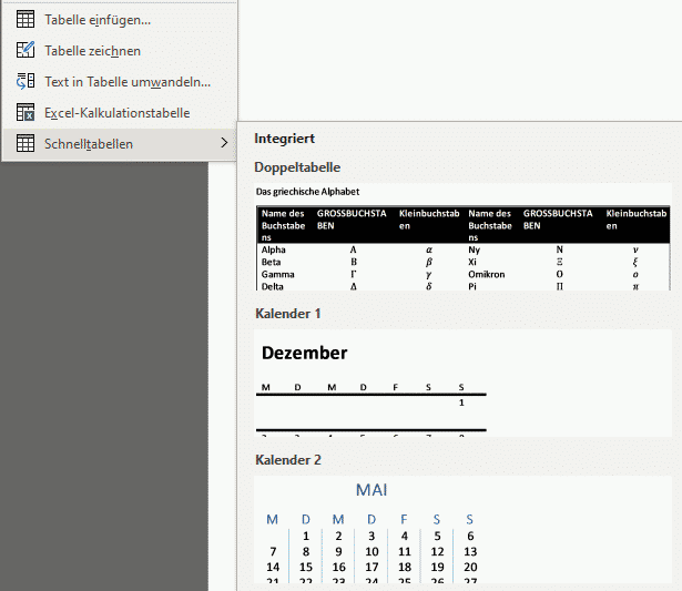 Dazu klicken Sie beim Einfügen der Tabelle im Menü ganz unten auf Schnelltabellen und wählen dann aus der Liste mit den Voransichten die entsprechende Tabelle aus.