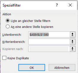 - Wenn die bereinigten Daten an einen anderen Ort kopiert werden sollen, dann klickt auf An eine andere Stelle kopieren. Erst nach Aktivierung der Option könnt Ihr unter Kopieren nach den Zielbereich für die bereinigte Liste angeben.