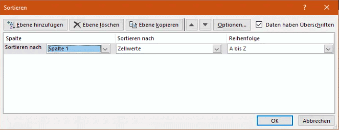 - Wenn Ihr die gesamte Tabelle markiert haben und die Zellen Überschriften haben, dann setzt einen Haken bei Daten haben Überschriften. Jetzt könnt Ihr für das erste Sortierkriterium die Art der Sortierung auswählen. Wenn Ihr innerhalb der Zeilen nach einer weiteren Spalte sortieren wollt, dann klickt auf Ebene hinzufügen.