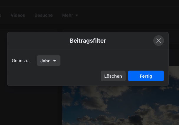 - Wenn es zu viele sind, dann klickt auf Filter und wählt das Jahr aus, das euch interessiert. Ihr könnt auch nach Inhaltstyp filtern (Fotos, Videos, Text-Posts).
