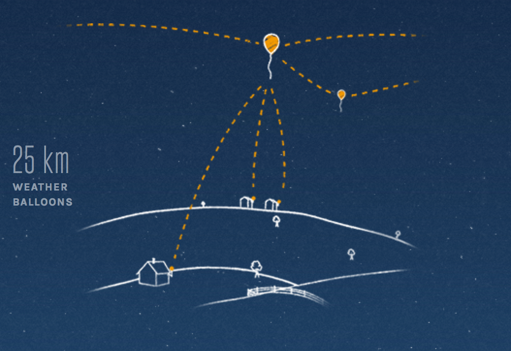Google schlägt vor, spezielle Ballons zu bauen, die bis 20 km in die Höhe geschickt werden. Nicht einzelne, sondern Dutzende, später Hunderte. Betrieben mit Sollarenergie, getrieben von den Winden, die es dort oben gibt. Die Ballons lassen sich von der Erde anfunken und bieten so Zugang zum Internet, denn die Ballons sind wiederum untereinander vernetzt und letztlich mit einer Basisstation verbunden.